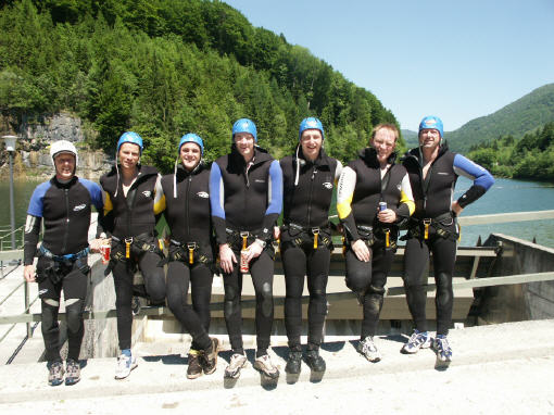 Am Samstag dann wurde es ernst. Eine Canyoing Tour stand an. Geführt wurden wir von Gottfried und seinem Sohn Florian. Wir zwängten uns in enge Neoprenanzüge und schicke Helme, los ging es in eine Klamm. Das Wasser hatte eine Temperatur von ca. 8 C. Beim Canyoing durchquert man die Klamm per Fuß, Sprung oder auch schwimmend. Die Sprünge fanden zwischen